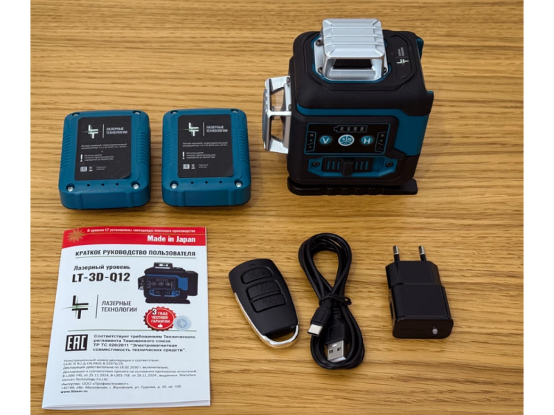 К покупателю лазерный нивелир попадает в тканевом кейсе, на лицевой стороне которых зафиксирована информация по ключевым особенностям, характеристикам. Отдельно отмечена 3-летнее гарантийное сопровождение на территории России.Внутреннее пространство сумки заполнено мягкой пеной с отсеками для хранения самого устройства и комплектных аксессуаров.Владелец получает два аккумулятора емкостью 8000 мАч, зарядное устройство с индикатором, USB-C кабель, пульт ДУ, краткое руководство пользователя на русском языке.Внешний вид